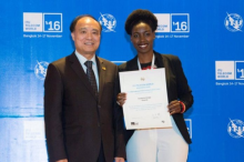 Muganga Mariam ari kumwe n’Umunyamabanga Mukuru wa ITU, Houlin Zhao ubwo yari amaze kumushyikiriza igihembo.